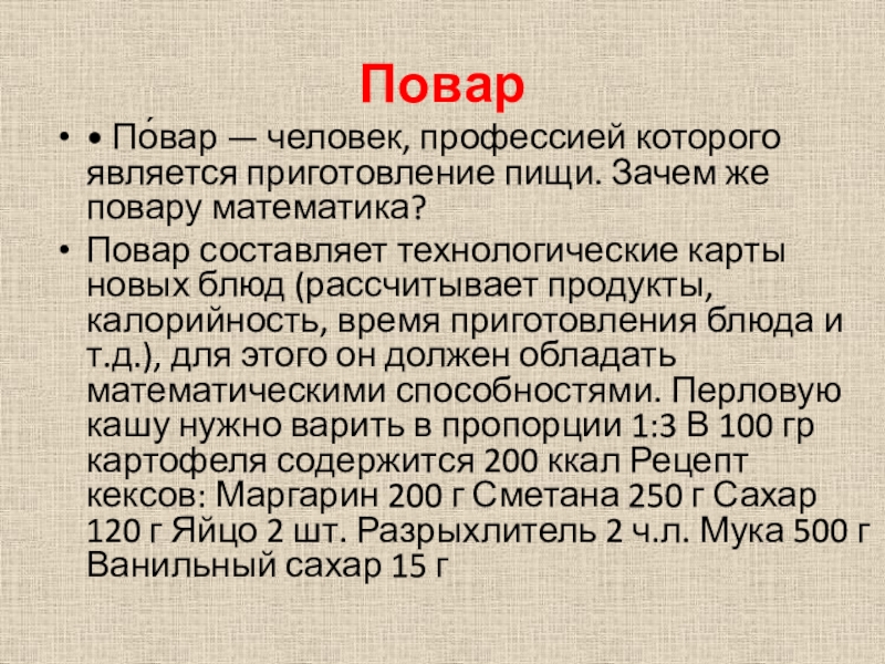 Повар составляет технологические карты новых блюд (рассчитывает продукты, калорийность, время приготовления блюда и т.д.), для этого он должен обладать математическими способностями. Перловую кашу нужно варить в пропорции 1:3 В 100 гр картофеля содержится 200 ккал Рецепт кексов: Маргарин 200 г Сметана 250 г Сахар 120 г Яйцо 2 шт. Разрыхлитель 2 ч.л. Мука 500 г Ванильный сахар 15 г