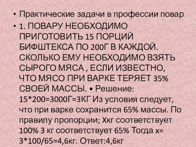 БИФШТЕКСА ПО 200Г В КАЖДОЙ. СКОЛЬКО ЕМУ НЕОБХОДИМО ВЗЯТЬ СЫРОГО МЯСА , ЕСЛИ ИЗВЕСТНО, ЧТО МЯСО ПРИ ВАРКЕ ТЕРЯЕТ 35% СВОЕЙ МАССЫ. • Решение: 15*200=3000Г=3КГ Из условия следует, что при варке сохранится 65% массы. По правилу пропорции; Xкг соответствует 100% 3 кг соответствует 65% Тогда x= 3*100/65=4,6кг. Ответ:4,6кг