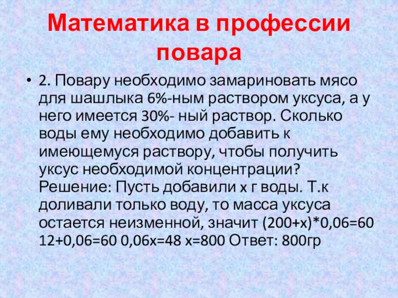 раствором уксуса, а у него имеется 30%- ный раствор. Сколько воды ему необходимо добавить к имеющемуся раствору, чтобы получить уксус необходимой концентрации? Решение: Пусть добавили x г воды. Т.к доливали только воду, то масса уксуса остается неизменной, значит (200+x)*0,06=60 12+0,06=60 0,06x=48 x=800 Ответ: 800гр