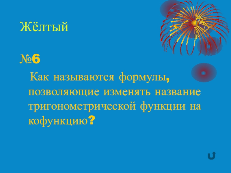 Жёлтый№6  Как называются формулы, позволяющие изменять название тригонометрической функции на кофункцию?