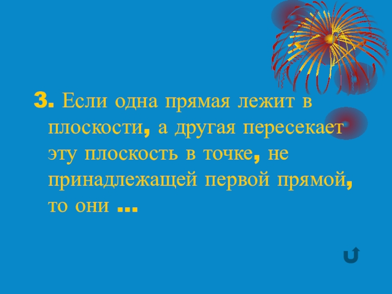 2 вопрос		Какие прямые не лежат в одной плоскости?ПересекающиесяПараллельныеСовпадающиеСкрещивающиеся