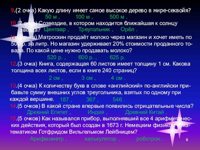 9.(2 очка) Сколько килограммов в 100 пудах?