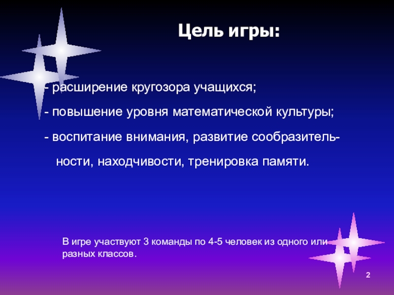 В игре участвуют 3 команды по 4-5 человек из одного или