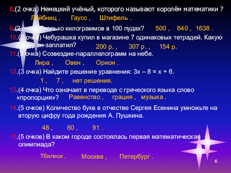 14.(5 очков) Количество букв в отчестве Сергея Есенина умножьте на