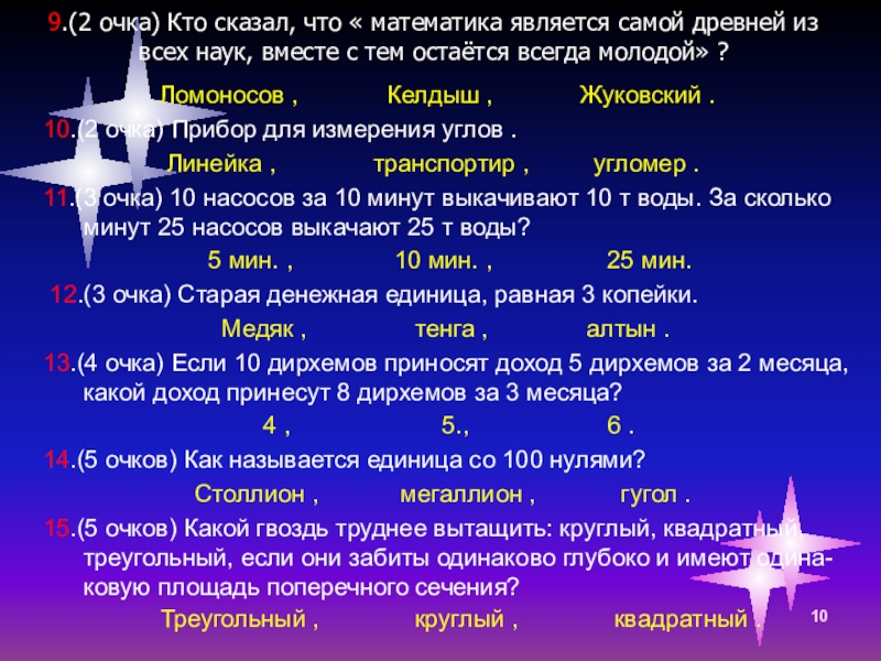 11.(3 очка) 10 насосов за 10 минут выкачивают 10 т воды. За сколько