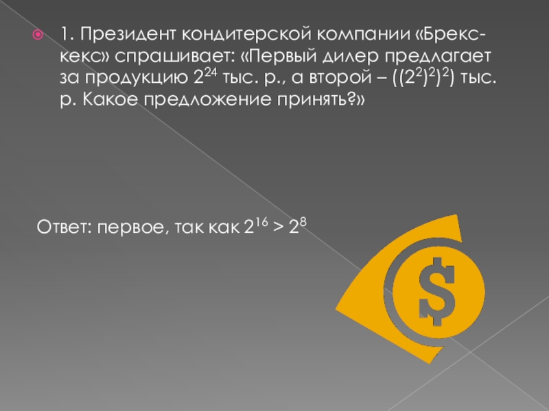 1. Президент кондитерской компании «Брекс-кекс» спрашивает: «Первый дилер предлагает за продукцию 224 тыс. р., а второй – ((22)2)2) тыс. р. Какое предложение принять?»Ответ: первое, так как 216 > 28