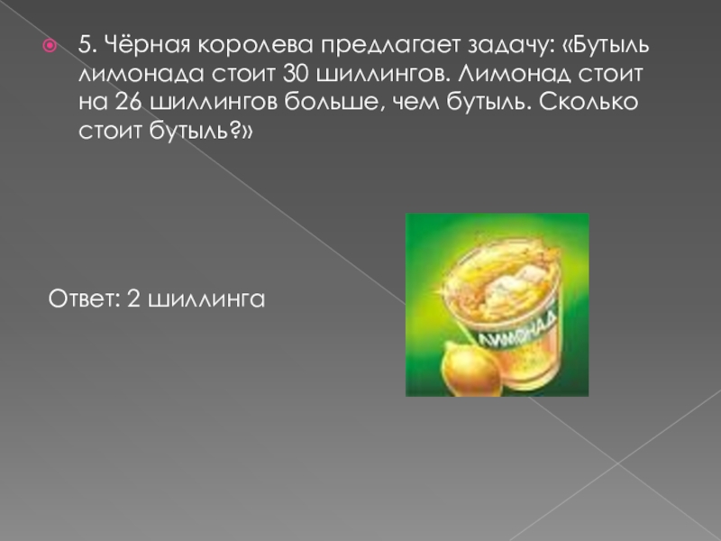 5. Чёрная королева предлагает задачу: «Бутыль лимонада стоит 30 шиллингов. Лимонад стоит на 26 шиллингов больше, чем
