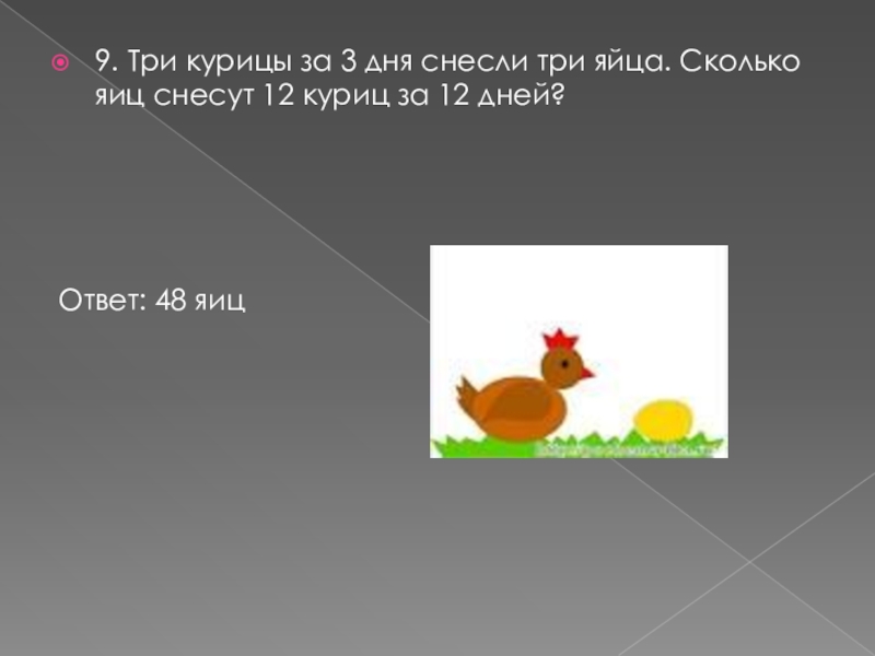 Слайд 109. Три курицы за 3 дня снесли три яйца. Сколько яиц
