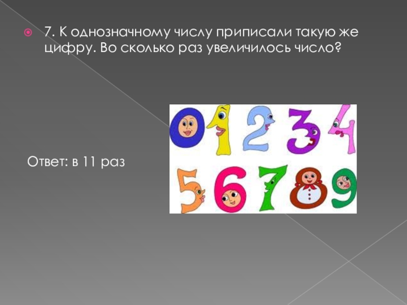 7. К однозначному числу приписали такую же цифру. Во сколько раз увеличилось число?Ответ: в 11 раз