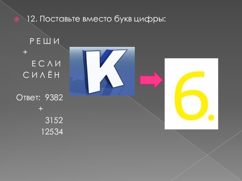 12. Поставьте вместо букв цифры:   Р Е Ш И  +