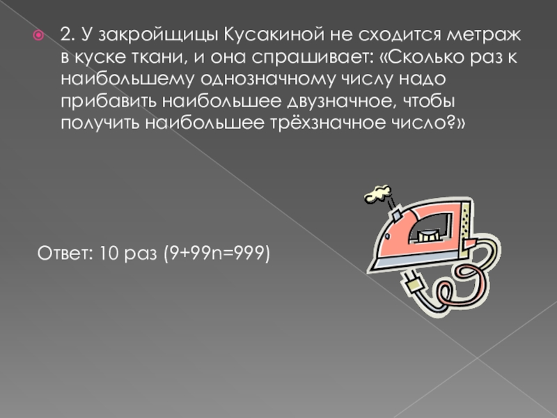 2. У закройщицы Кусакиной не сходится метраж в куске ткани, и она спрашивает: «Сколько раз к наибольшему