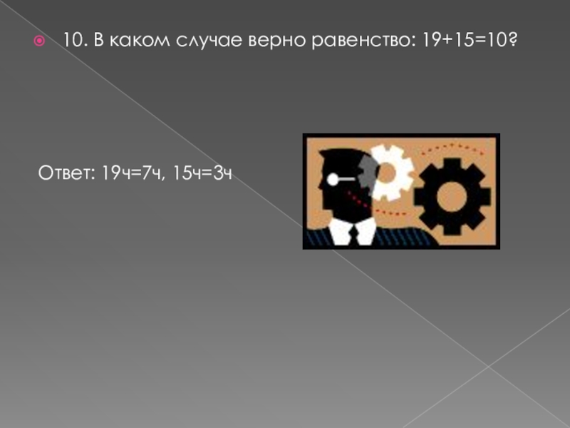 10. В каком случае верно равенство: 19+15=10?Ответ: 19ч=7ч, 15ч=3ч