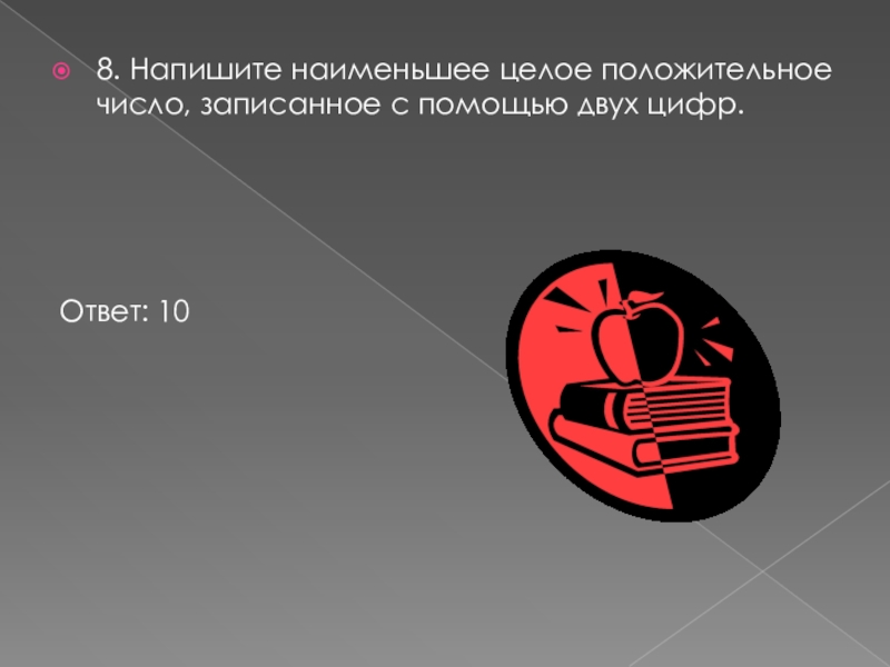 8. Напишите наименьшее целое положительное число, записанное с помощью двух цифр.Ответ: 10