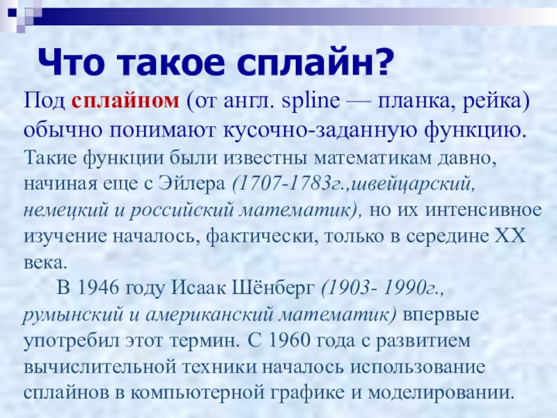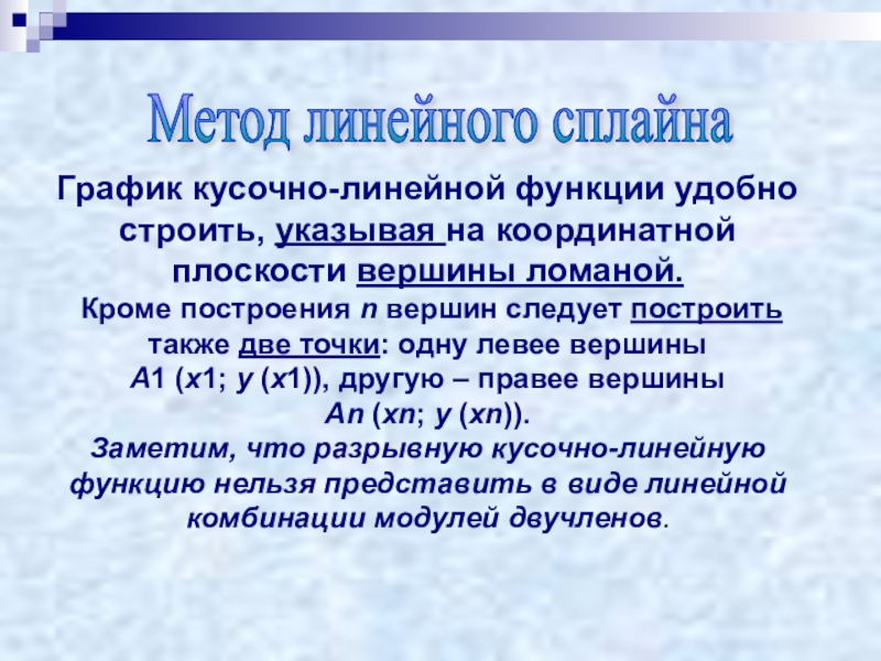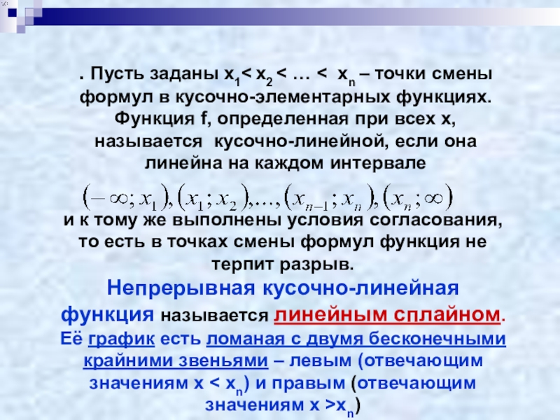 Непрерывная кусочно-линейная функция называется линейным сплайном. Её график есть ломаная с двумя бесконечными крайними звеньями – левым (отвечающим значениям x < xn) и правым (отвечающим значениям x >xn)
