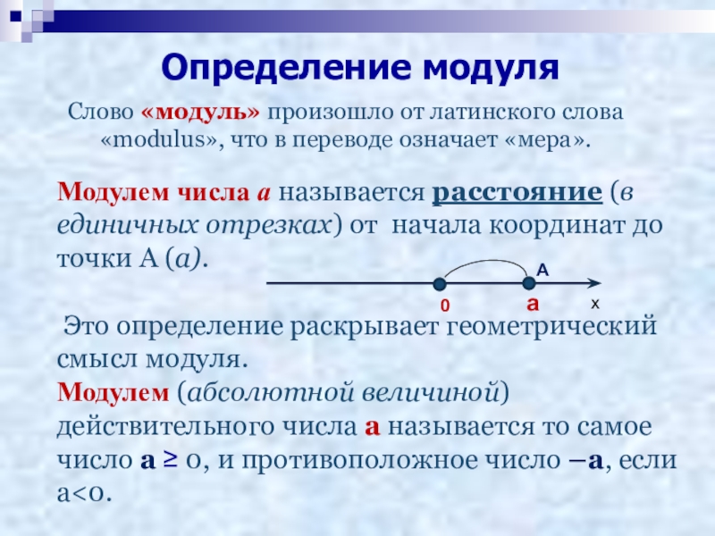 Модулем (абсолютной величиной) действительного числа а называется то самое число а ≥ 0, и противоположное число –а, если а<0.