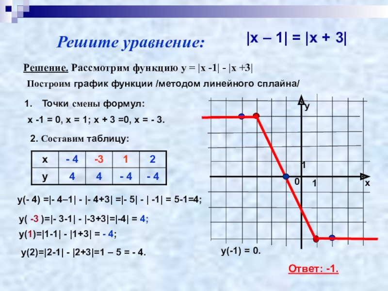 y(- 4) =|- 4–1| - |- 4+3| =|- 5| - | -1| = 5-1=4;