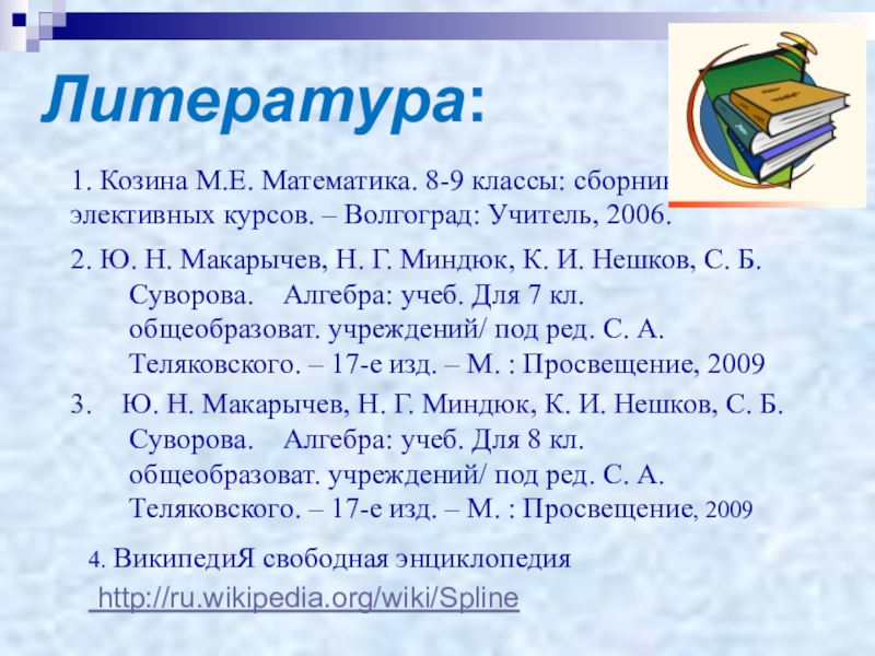 2. Ю. Н. Макарычев, Н. Г. Миндюк, К. И. Нешков, С. Б. Суворова. Алгебра: учеб. Для 7 кл. общеобразоват. учреждений/ под ред. С. А. Теляковского. – 17-е изд. – М. : Просвещение, 2009
