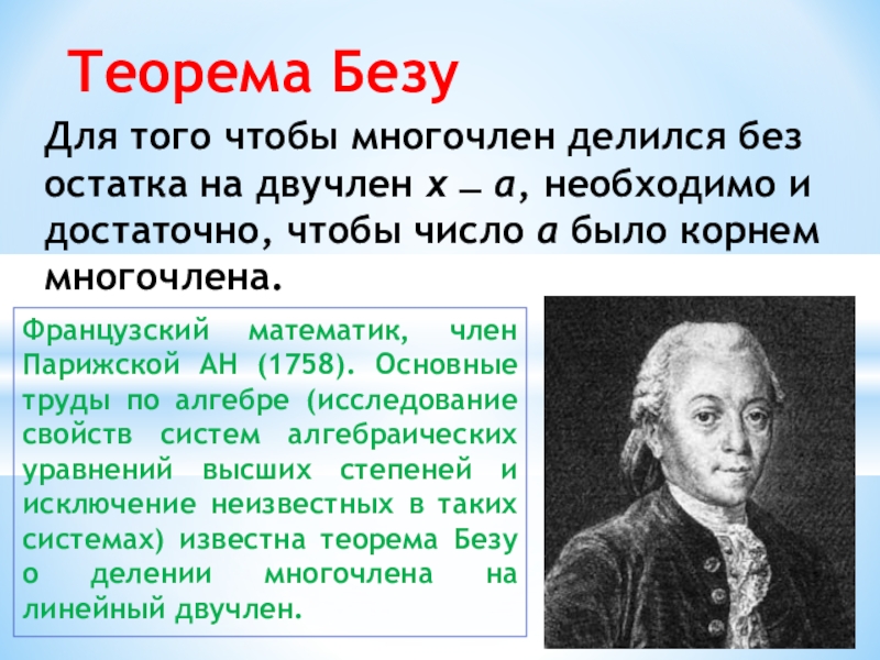 Французский математик, член Парижской АН (1758). Основные труды по алгебре (исследование свойств систем алгебраических уравнений высших степеней и исключение неизвестных в таких системах) известна теорема Безу о делении многочлена на линейный двучлен.