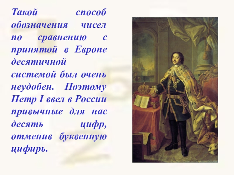 системой был очень неудобен. Поэтому Петр I ввел в России привычные для нас десять цифр, отменив буквенную цифирь.
