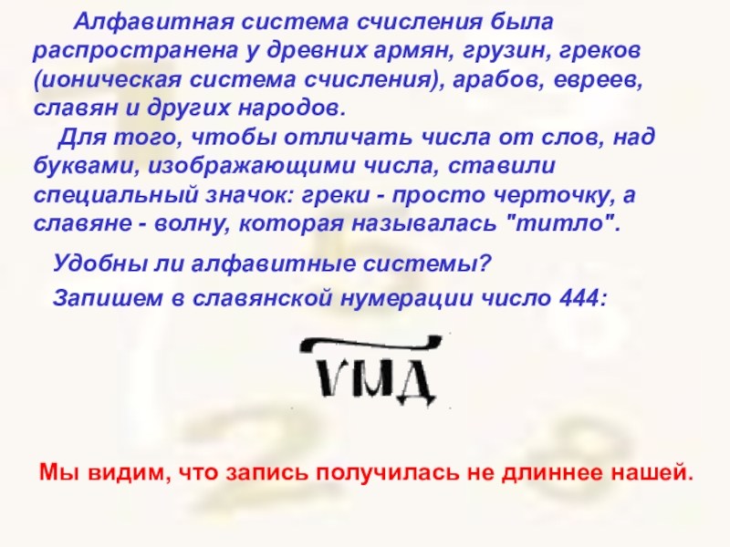 Слайд 26 Алфавитная система счисления была распространена у древних армян,