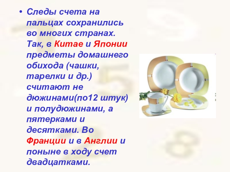 и Японии предметы домашнего обихода (чашки, тарелки и др.) считают не дюжинами(по12 штук) и полудюжинами, а пятерками и десятками. Во Франции и в Англии и поныне в ходу счет двадцатками.