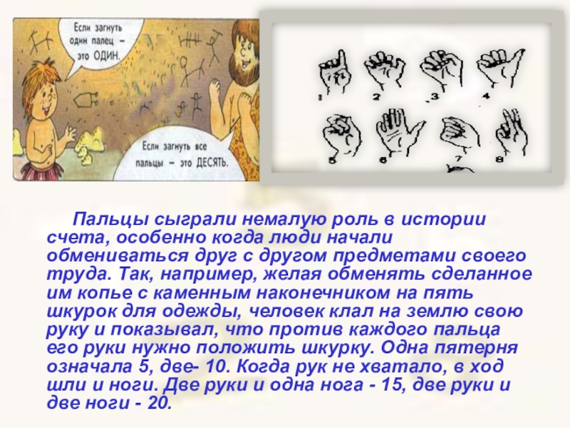 счета, особенно когда люди начали обмениваться друг с другом предметами своего труда. Так, например, желая обменять сделанное им копье с каменным наконечником на пять шкурок для одежды, человек клал на землю свою руку и показывал, что против каждого пальца его руки нужно положить шкурку. Одна пятерня означала 5, две- 10. Когда рук не хватало, в ход шли и ноги. Две руки и одна нога - 15, две руки и две ноги - 20.