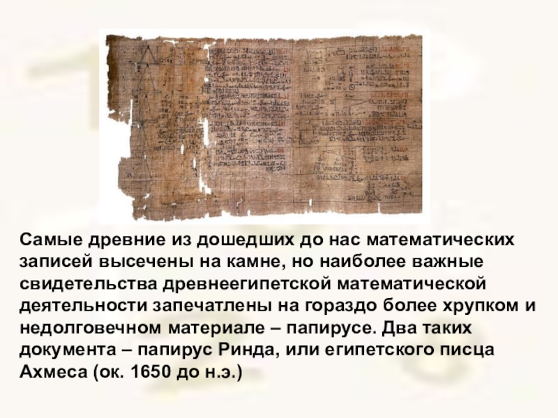 но наиболее важные свидетельства древнеегипетской математической деятельности запечатлены на гораздо более хрупком и недолговечном материале – папирусе. Два таких документа – папирус Ринда, или египетского писца Ахмеса (ок. 1650 до н.э.)