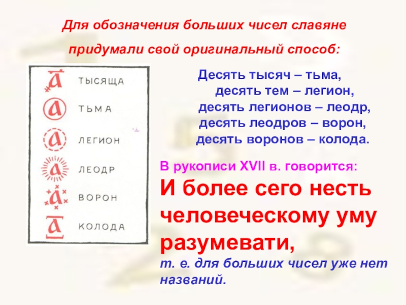 Слайд 27Для обозначения больших чисел славяне придумали свой оригинальный способ: