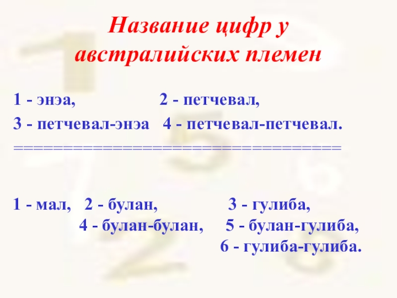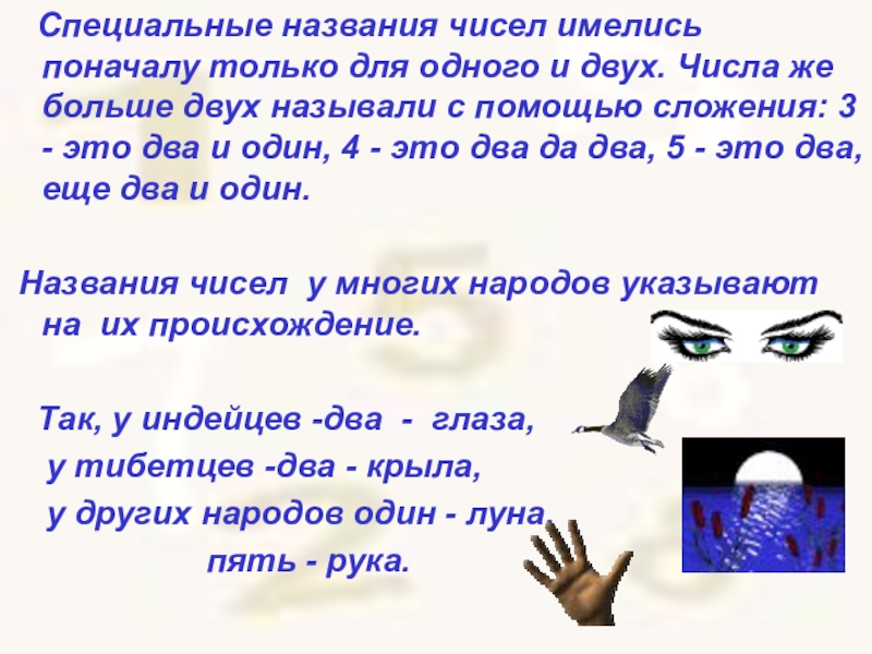 двух. Числа же больше двух называли с помощью сложения: 3 - это два и один, 4 - это два да два, 5 - это два, еще два и один.
