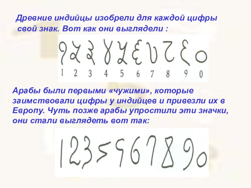 Арабы были первыми «чужими», которые заимствовали цифры у индийцев и привезли их в Европу. Чуть позже арабы упростили эти значки, они стали выглядеть вот так: