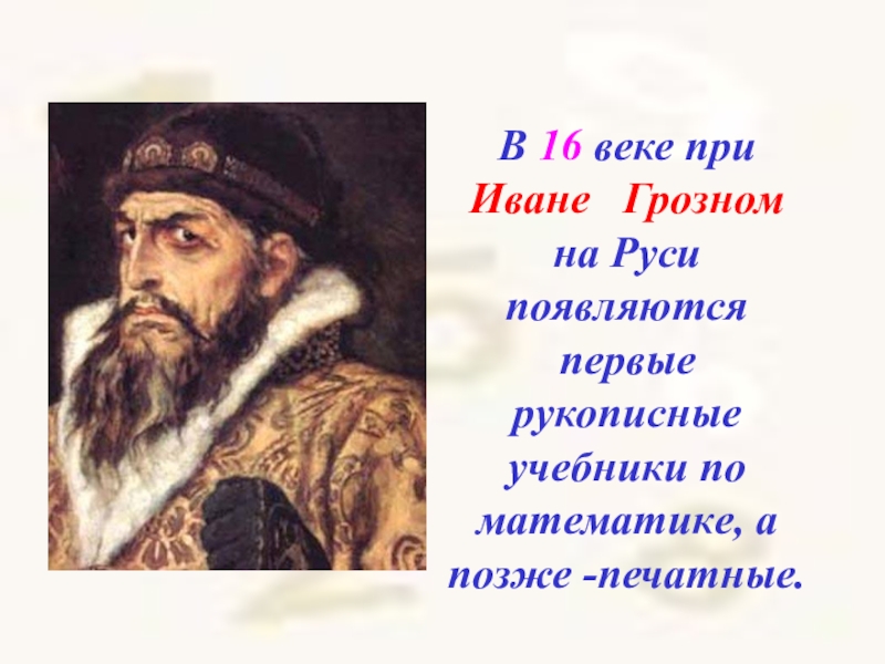 В 16 веке при Иване Грозном на Руси появляются первые рукописные учебники по математике, а позже -печатные.