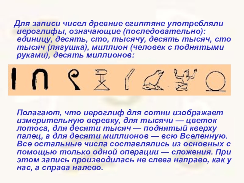 Полагают, что иероглиф для сотни изображает измерительную веревку, для тысячи — цветок лотоса, для десяти тысяч — поднятый кверху палец, а для десяти миллионов — всю Вселенную. Все остальные числа составлялись из основных с помощью только одной операции — сложения. При этом запись производилась не слева направо, как у нас, а справа налево.