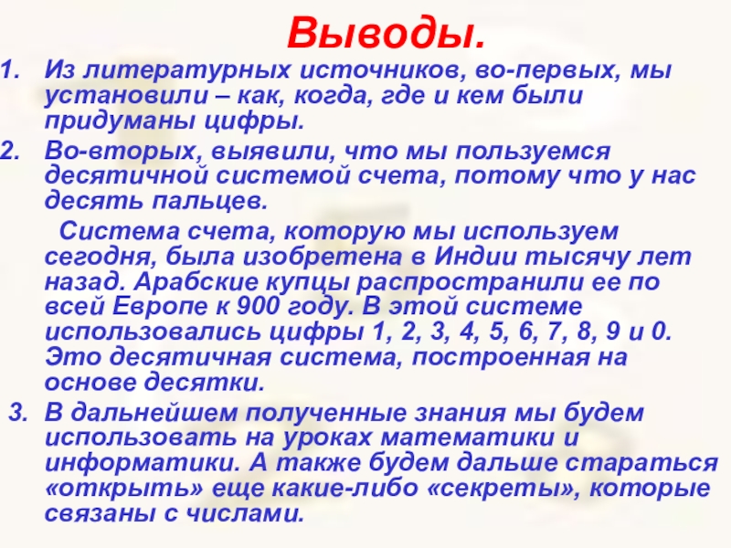 3. В дальнейшем полученные знания мы будем использовать на уроках математики и информатики. А также будем дальше стараться «открыть» еще какие-либо «секреты», которые связаны с числами.