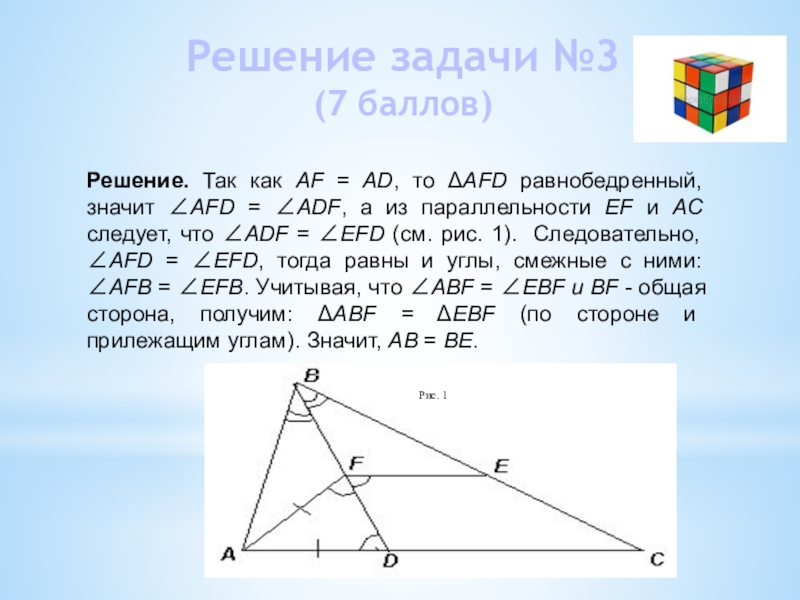 то АFD равнобедренный, значит АFD = АDF, а из параллельности EF и AC следует, что АDF = ЕFD (см. рис. 1). Следовательно, АFD = ЕFD, тогда равны и углы, смежные с ними: АFВ = ЕFВ. Учитывая, что АВF = ЕВF и BF - общая сторона, получим: АВF = ЕВF (по стороне и прилежащим углам). Значит, AВ = ВЕ.