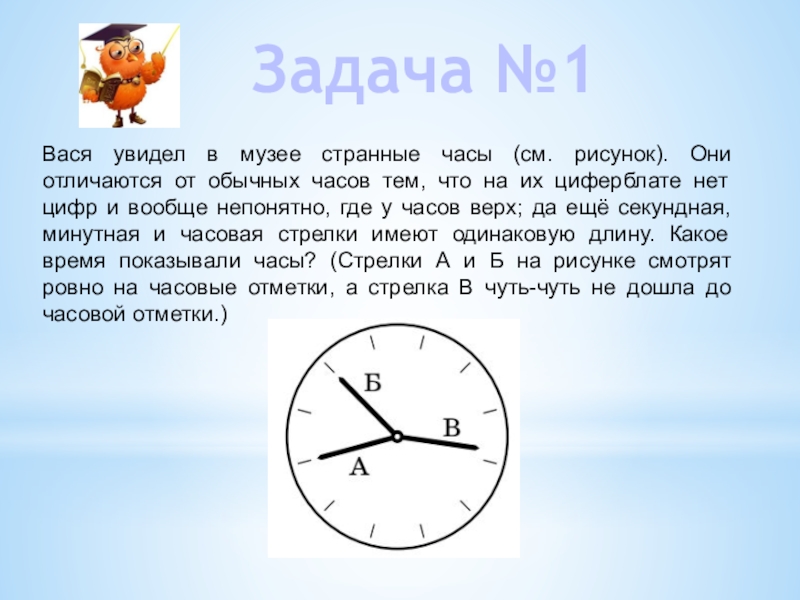отличаются от обычных часов тем, что на их циферблате нет цифр и вообще непонятно, где у часов верх; да ещё секундная, минутная и часовая стрелки имеют одинаковую длину. Какое время показывали часы? (Стрелки А и Б на рисунке смотрят ровно на часовые отметки, а стрелка В чуть-чуть не дошла до часовой отметки.)