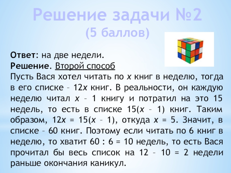 Пусть Вася хотел читать по х книг в неделю, тогда в его списке – 12x книг. В реальности, он каждую неделю читал х – 1 книгу и потратил на это 15 недель, то есть в списке 15(х – 1) книг. Таким образом, 12x = 15(х – 1), откуда x = 5. Значит, в списке – 60 книг. Поэтому если читать по 6 книг в неделю, то хватит 60 : 6 = 10 недель, то есть Вася прочитал бы весь список на 12 – 10 = 2 недели раньше окончания каникул.