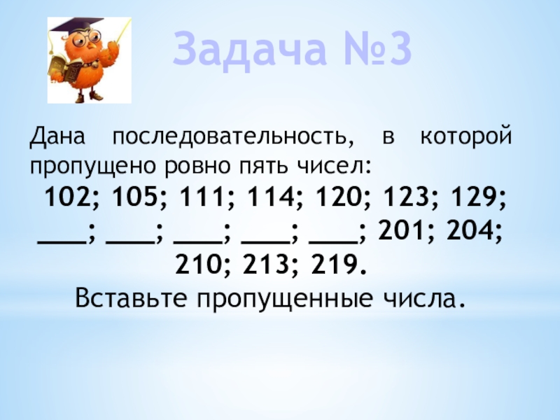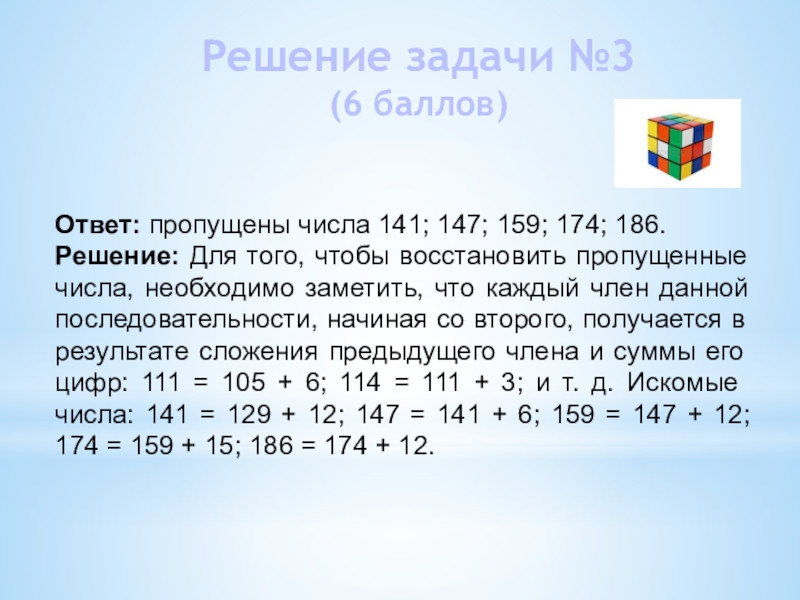 Решение: Для того, чтобы восстановить пропущенные числа, необходимо заметить, что каждый член данной последовательности, начиная со второго, получается в результате сложения предыдущего члена и суммы его цифр: 111 = 105 + 6; 114 = 111 + 3; и т. д. Искомые числа: 141 = 129 + 12; 147 = 141 + 6; 159 = 147 + 12; 174 = 159 + 15; 186 = 174 + 12.