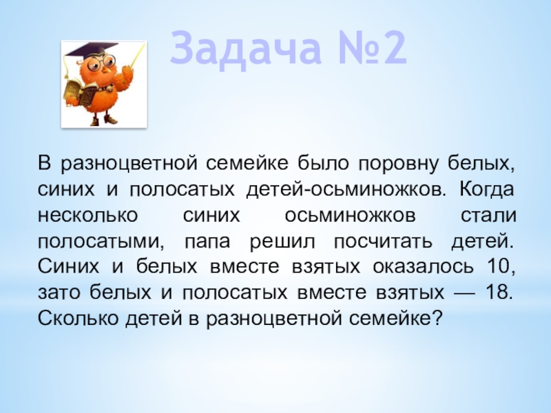 Второе решение. После перекрашивания полосатых осьминожков стало на 18 − 10 = 8 больше, чем синих. Значит, полосатыми стали 8 : 2 = 4 синих осьминожка. Белых и «старых полосатых» было 18 − 4 = 14, то есть по 14 : 2 = 7 каждого цвета. А всего в разноцветной семейке 3 · 7 = 21 ребёнок.