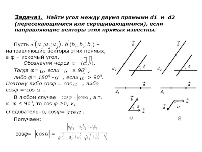 Пусть а (a1;а2;а3), b (b1; b2; b3) – направляющие векторы этих прямых, а φ – искомый угол.