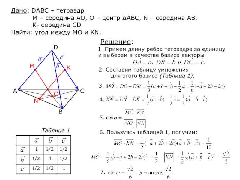 1. Примем длину ребра тетраэдра за единицу и выберем в качестве базиса векторы