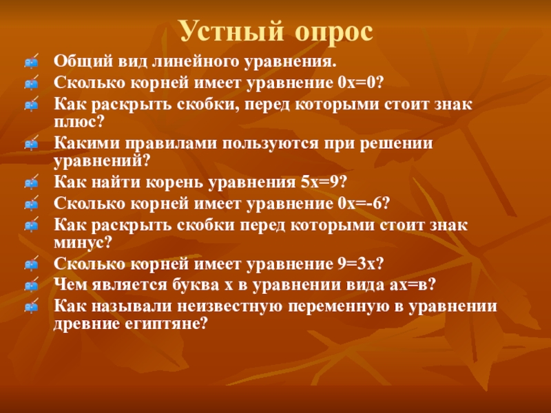 Устный опросОбщий вид линейного уравнения.  Сколько корней имеет уравнение 0х=0? Как раскрыть скобки, перед которыми стоит