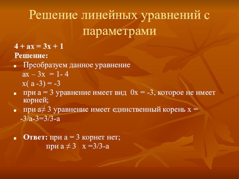Решение линейных уравнений с параметрами4 + ах = 3х + 1 Решение:Преобразуем данное уравнение  ах –
