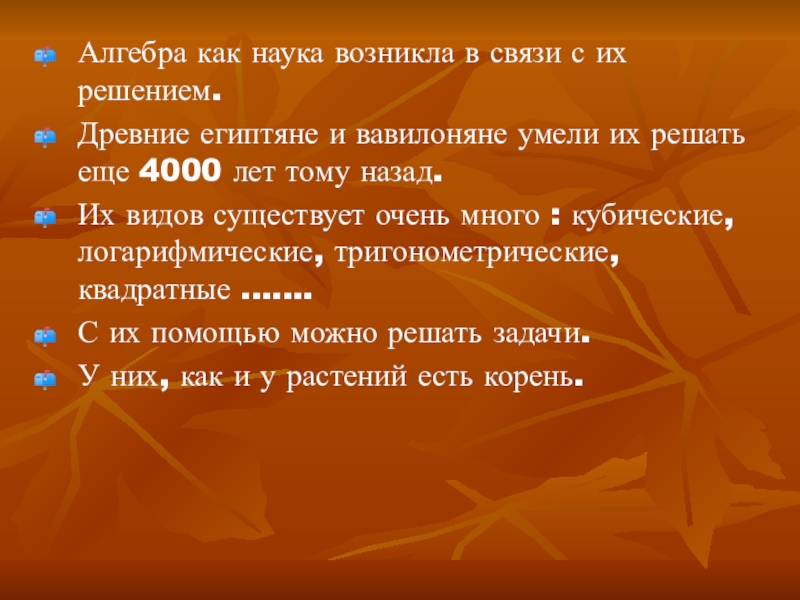 Алгебра как наука возникла в связи с их решением.Древние египтяне и вавилоняне умели их решать еще 4000