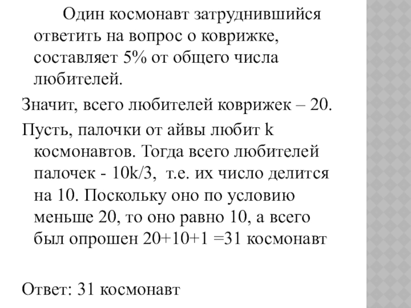 Слайд 7 Один космонавт затруднившийся ответить на вопрос о коврижке, составляет 5% от