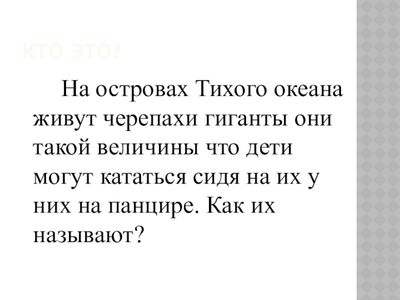 Кто это?		На островах Тихого океана живут черепахи гиганты они такой величины что дети могут кататься сидя на