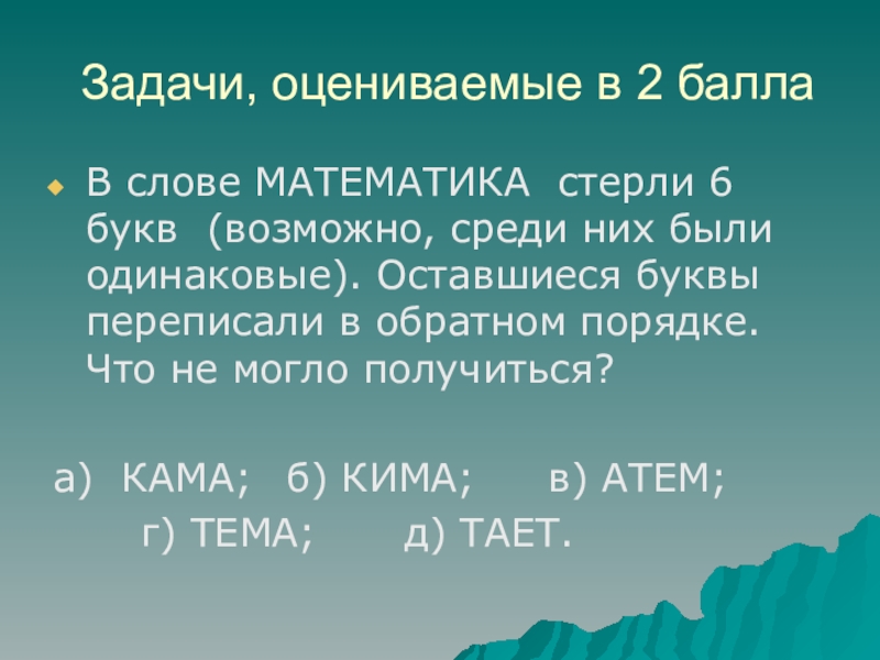 В слове МАТЕМАТИКА стерли 6 букв (возможно,