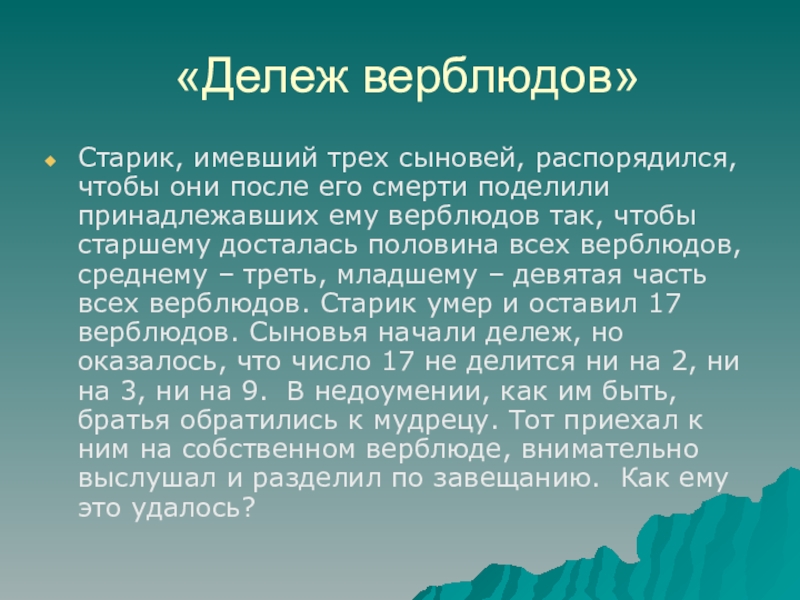 поделили принадлежавших ему верблюдов так, чтобы старшему досталась половина всех верблюдов, среднему – треть, младшему – девятая часть всех верблюдов. Старик умер и оставил 17 верблюдов. Сыновья начали дележ, но оказалось, что число 17 не делится ни на 2, ни на 3, ни на 9. В недоумении, как им быть, братья обратились к мудрецу. Тот приехал к ним на собственном верблюде, внимательно выслушал и разделил по завещанию. Как ему это удалось?
