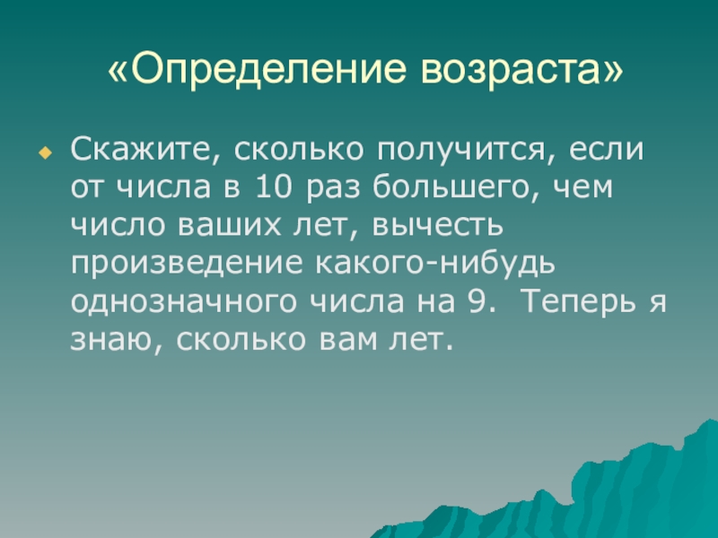 чем число ваших лет, вычесть произведение какого-нибудь однозначного числа на 9. Теперь я знаю, сколько вам лет.