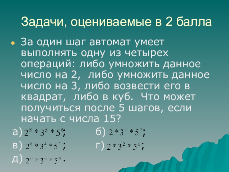 из четырех операций: либо умножить данное число на 2, либо умножить данное число на 3, либо возвести его в квадрат, либо в куб. Что может получиться после 5 шагов, если начать с числа 15?
