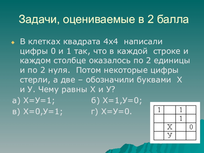 и 1 так, что в каждой строке и каждом столбце оказалось по 2 единицы и по 2 нуля. Потом некоторые цифры стерли, а две – обозначили буквами Х и У. Чему равны Х и У?